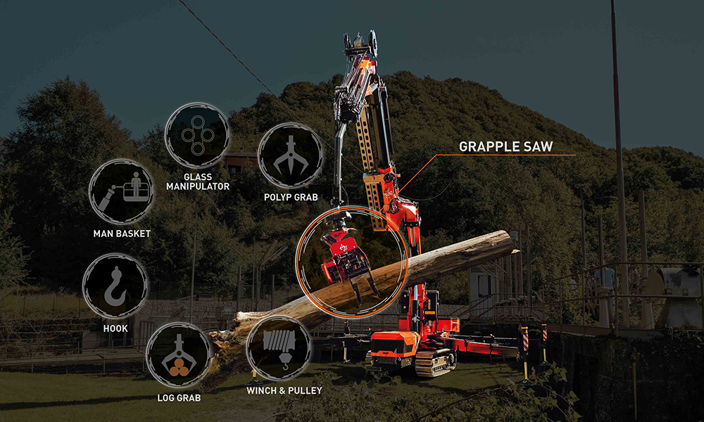 The company statement added that the operator of a JF545 V-Max can choose from a wide range of applications. The standard model already adapts to various operational environments but the V-Max version allows for even more varied applications: from its traditional use in constructions, industry, logistics and handling in confined spaces to more innovative uses with the grapple saw, such as in green areas maintenance.